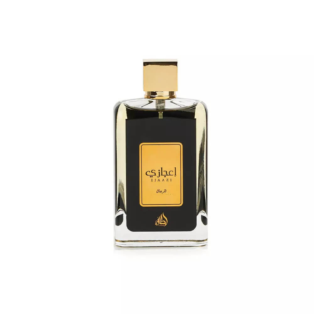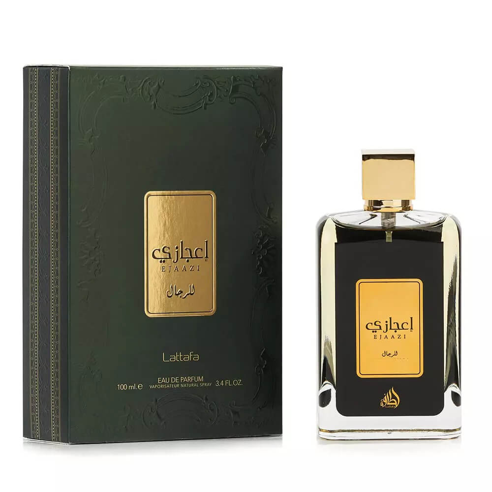 Parfum arăbesc Lattafa, Ejaazi este un parfum Oriental masculin din gama brandului LATTAFA. Acest parfum ne întâmpina cu notele de cardamom, levănțică, citrice, portocală; urmate de paciuli, piper negru, scortisoara, lăcrămioară lăsând în urma sa tonuri de ambră, lemn de cedru, lichen, note lemnoase, vetiver . Parfumul este perfect echilibrat: moderat cu o proiectare de 1 metru - moderat, si poate fi purtat in zilele de primavara, vara, toamna oferind un plus de rafinament.